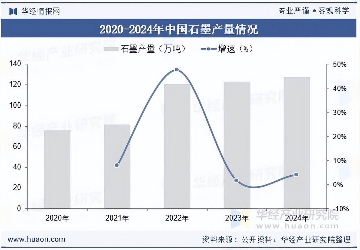 石墨分为天然石墨和人造石墨两大类,天然石墨来自石墨矿藏。石墨因其独特的物理化学性质,在冶金、机械、电子、军工、国防、航天航空等领域有广泛应用。据统计,2024年我国石墨产量为128万吨。