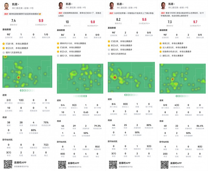 新赛季开赛拜仁前4场比赛,凯恩全部首发出场,贡献6球2助攻。从球员的活动热区图上看凯恩几乎覆盖全场,甚至是回防到了己方禁区。