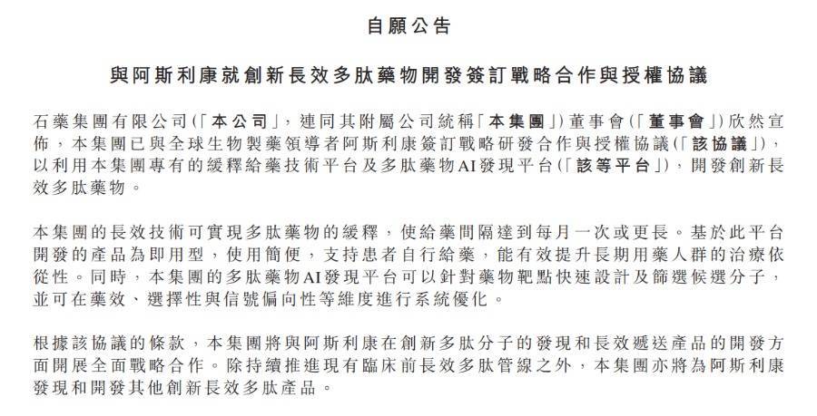 1月30日开盘前,石药集团(1093.HK)公告称,已与阿斯利康签署战略研发合作与授权协议。双方将依托石药集团专有的缓释给药技术平台及多肽药物AI发现平台,联合开发创新长效多肽药物。