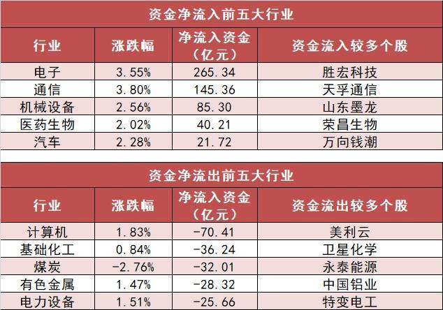 3. 电子行业净流入265.34亿元居首