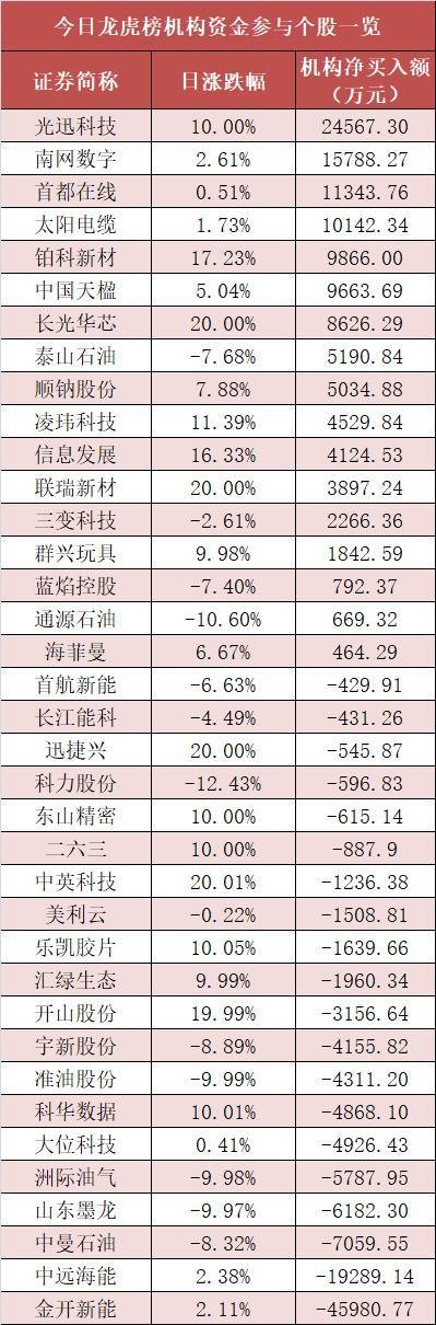盘后龙虎榜数据显示,机构现身多股,其中光迅科技等股票呈现机构资金净买入,金开新能等股票呈现机构资金净卖出。