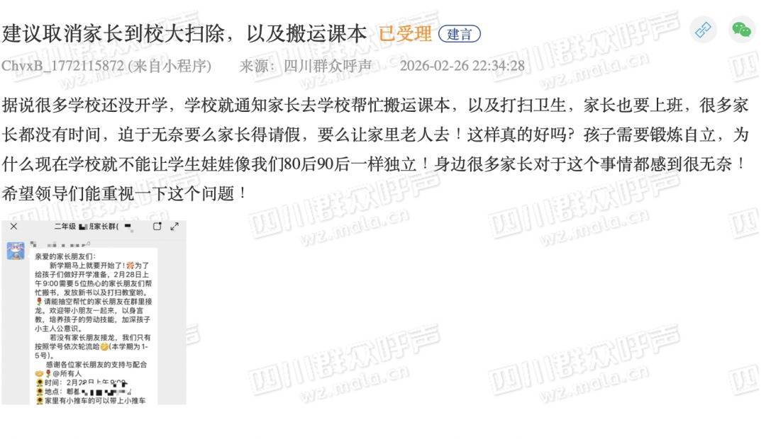 2月26日,“四川群众呼声”平台上,一条“建议取消家长到校大扫除,以及搬运课本”的投诉,引发网友关注。